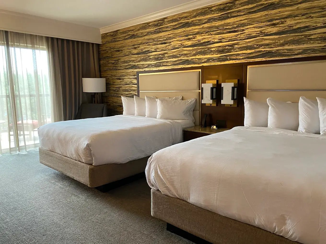 Includes: 55" Tv, dresser, headboard(s) & lighting, mattress/box spring & closed frame set(s), granite top nightstands, desk with power outlets, leather desk chair, upholstered chair, sleeper sofa & ottoman (kings), side table, desk lamp, floor lamp, art.